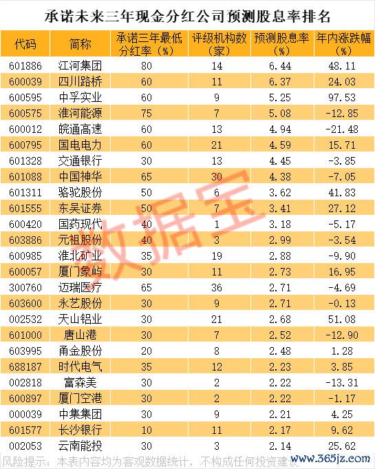 未来三年现金分红公司预测股息率排名未来三年现金分红公司预测股息率排名