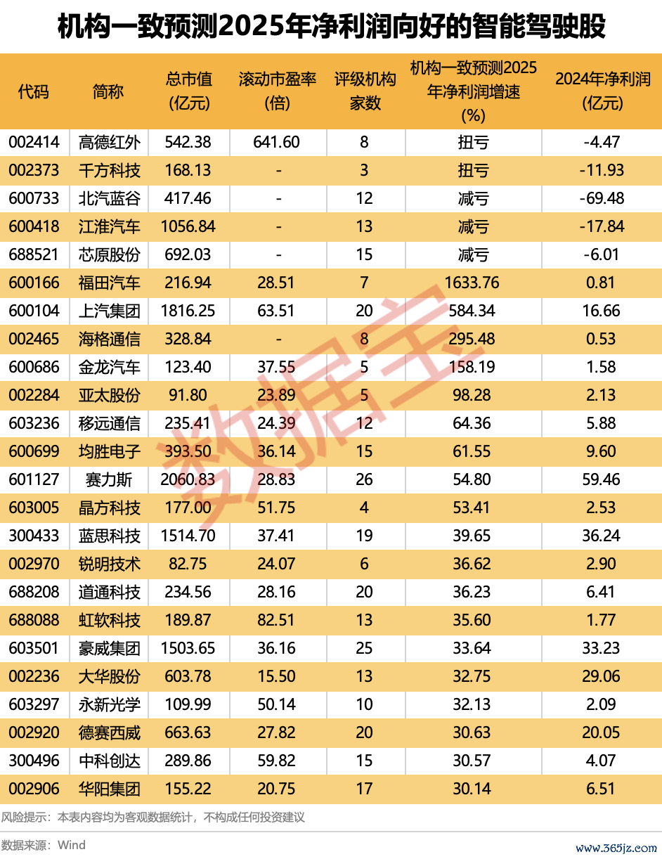 机构一致预测2025年净利润向好的智能驾驶股一览机构一致预测2025年净利润向好的智能驾驶股一览
